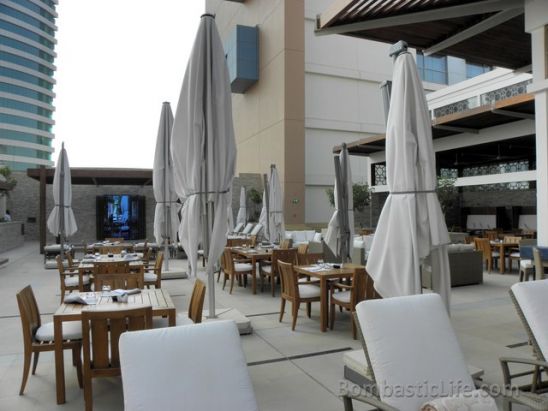 Dining area near the pool at Kempinski Hotel Grand in Bahrain.