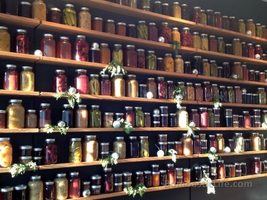Wall lined with various canned items at Gilead Cafe and Bistro in Toronto..