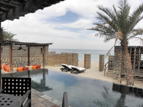 Deck, Day Bed, Lounge Chairs and Pool of our Beach Front Pool Villa at Six Senses Zighy Bay in Oman.