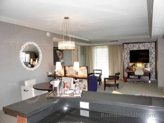 ![]() View of the Dining Room and Living Room from the Kitchenette of our Wrap Around Suite at The Cosmo Hotel in Las Vegas. |